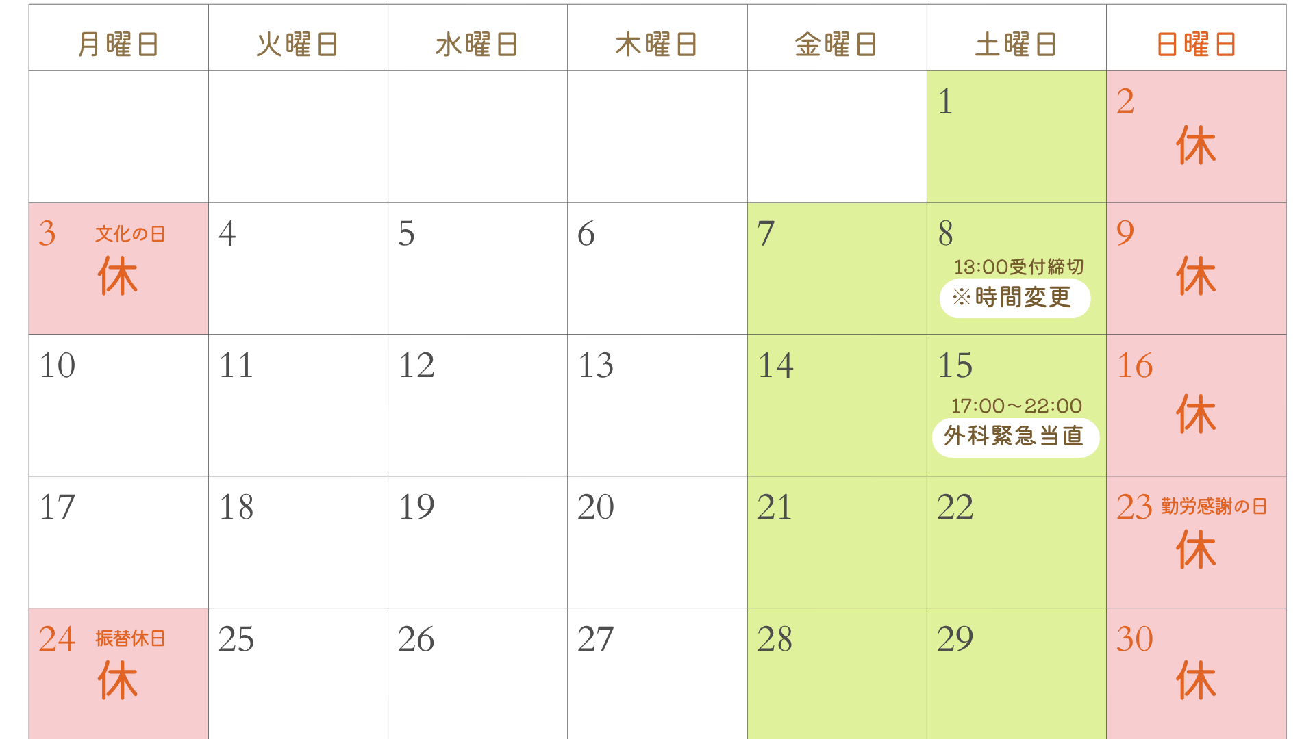 午後休診日※土曜日は9:00~14:00となります※11月8日(土)は13:00で受付終了となります※11月15日(土)17:00~22:00は外科緊急当直日です