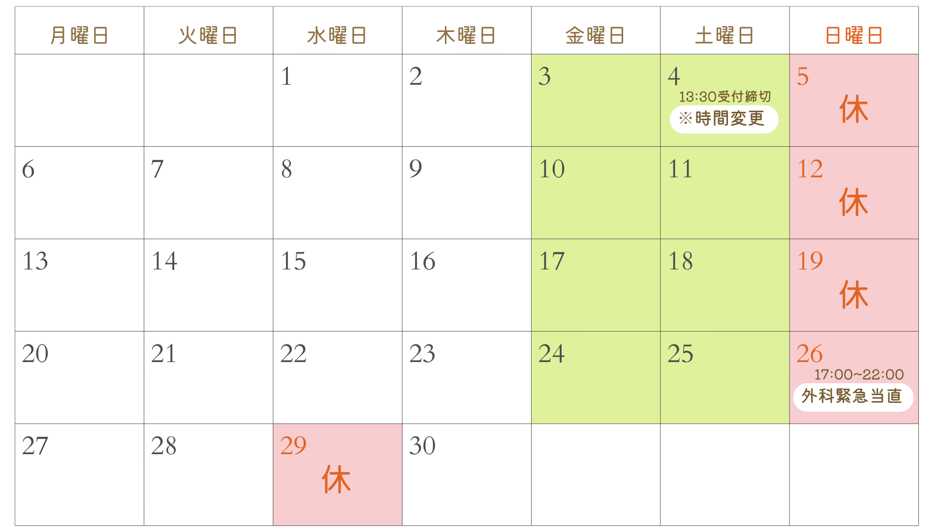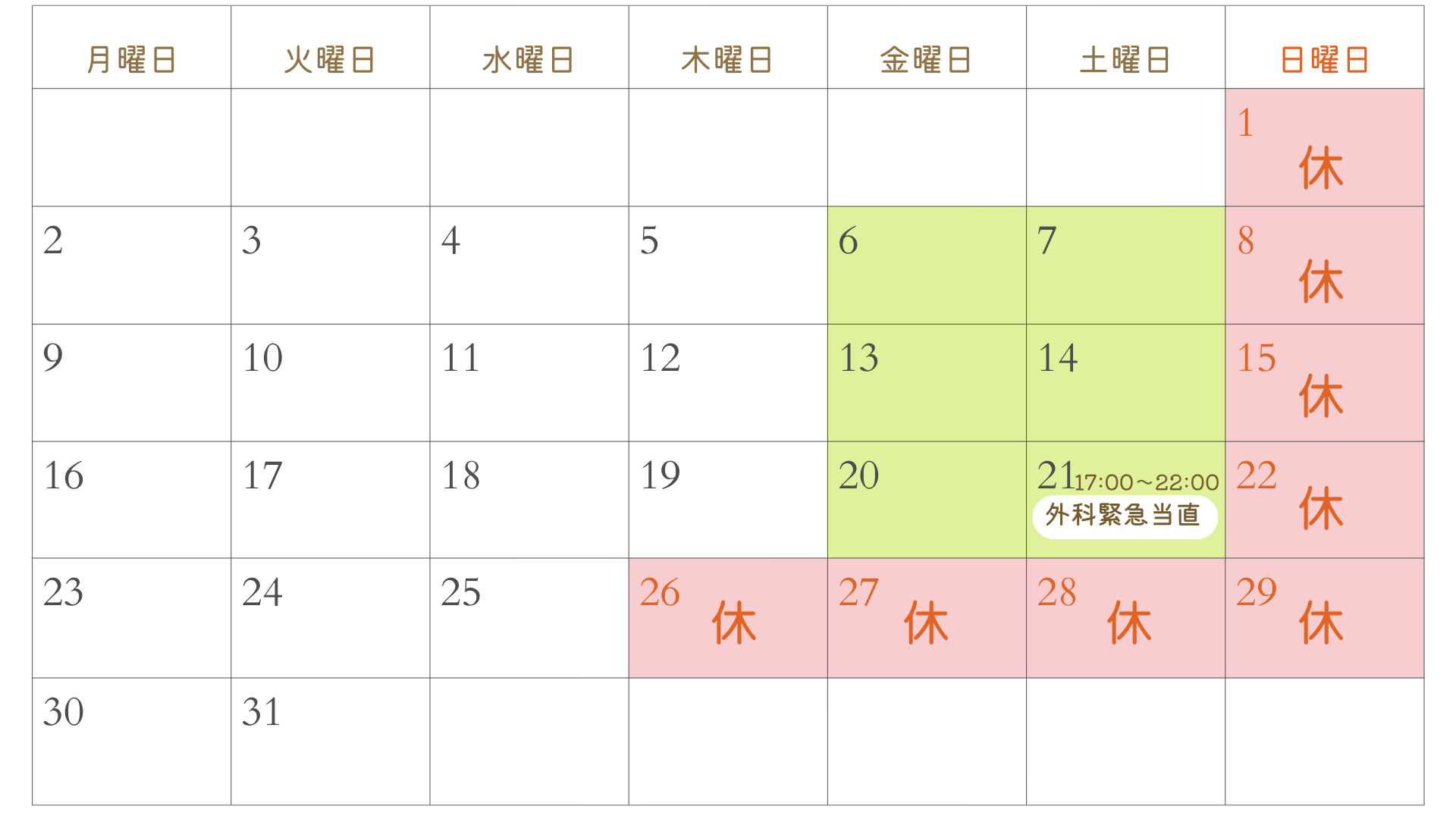 午後休診日※土曜日は9:00~14:00となります※3月21日(土)17:00~22:00は外科緊急当直日です